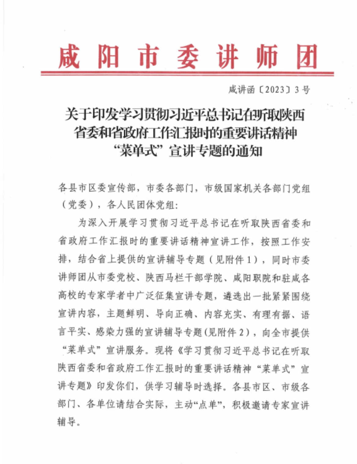 为进一步推动学习贯彻习近平新时代中国特色社会主义思想主题教育走深走实,深入学习贯彻习近平总书记在听取陕西省委和省政府工作汇报时的重要讲话精神,太阳成集团tyc33455cc根据中共咸阳市委讲师团《关于征集学习贯彻习近平总书记在听取陕西省委和省政府工作汇报时的重要讲话宣讲专题的通知》,侯帆、吴文娟、韩雨颖三位教师选报的宣讲题目《强化教育、科技、人才一体化发展理念,推动陕西高等教育高质量发展》《全面推动建设陕西人与自然和谐共生的现代化》《用好陕西历史文化资源和红色文化资源》入选咸阳市“菜单式”宣讲专题。
