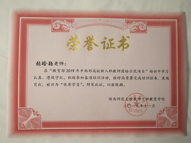 2019年11月初,思想政治理论教学部张晗颖老师有幸参加了“教育部2019年中西部高校新入职教师国培示范项目”,此次培训为期20天,张晗颖老师在培训中学习认真、遵规守纪、积极参加各项培训活动,同时也能够按时完成培训任务,表现突出,最终被评选为“优秀学员”。