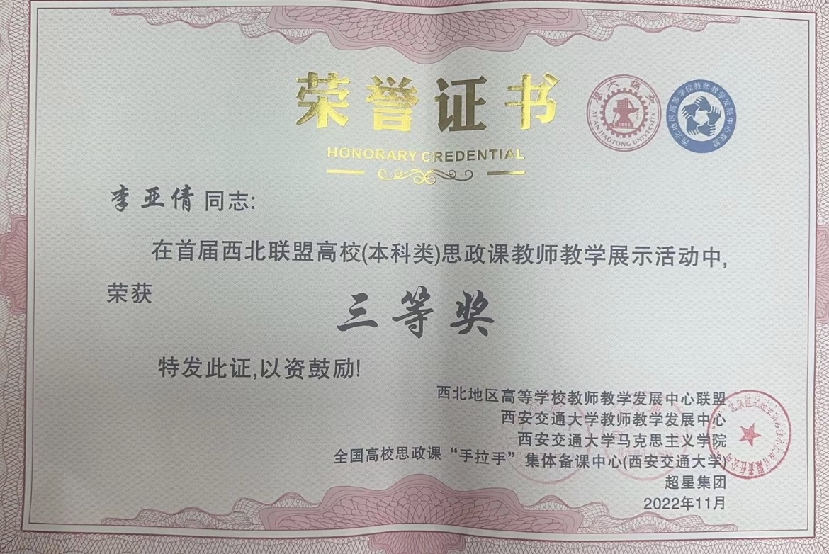 近日,公司李亚倩、刘晓越两位教师在首届西北联盟高校思政课教师教学展示活动中荣获三等奖,这充分展示了公司思政课程教师的授课风采,推动了学校思政课程教学高质量创新发展。 此次教学展示活动由西北地区高等学校教...